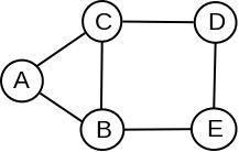 Slika 2: Neusmeren graf koji sadrži Ojlerov ciklus. Jedan Ojlerov ciklus u ovom grafu je (C, D, E, C, A, B, C).