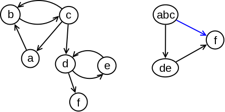 Ako je tranzitivno zatvorenje grafa \(G\) gust graf, efikasnije je najpre izračunati komponente jake povezanosti grafa \(G\). Za svaka dva čvora iz iste komponente jake povezanosti važi da su međusobno dostižni, pa u tranzitivnom zatvorenju treba da budu povezani granama. Ako postoji grana \((u,v)\) koja povezuje čvorove iz različitih jakih komponenti povezanosti, svaki čvor iz komponente kojoj pripada čvor \(v\) je dostižan iz svakog čvora komponente kojoj pripada čvor \(u\) i odgovarajuću granu treba dodati tranzitivnom zatvorenju grafa \(G\). Dakle, problem se svodi na pronalaženje tranzitivnog zatvorenja komprimovanog grafa, sačinjenog od jakih komponenti povezanosti, koji obično ima dosta manje čvorova i grana (slika 2). Ako postoji \(K\) komponenti jake povezanosti, složenost određivanja tranzitivnog zatvorenja komprimovanog grafa je \(O(K^3)\), što može biti znatno manje od \(O(|V|^3)\) kada je \(K\) dovoljno manje od \(|V|\).